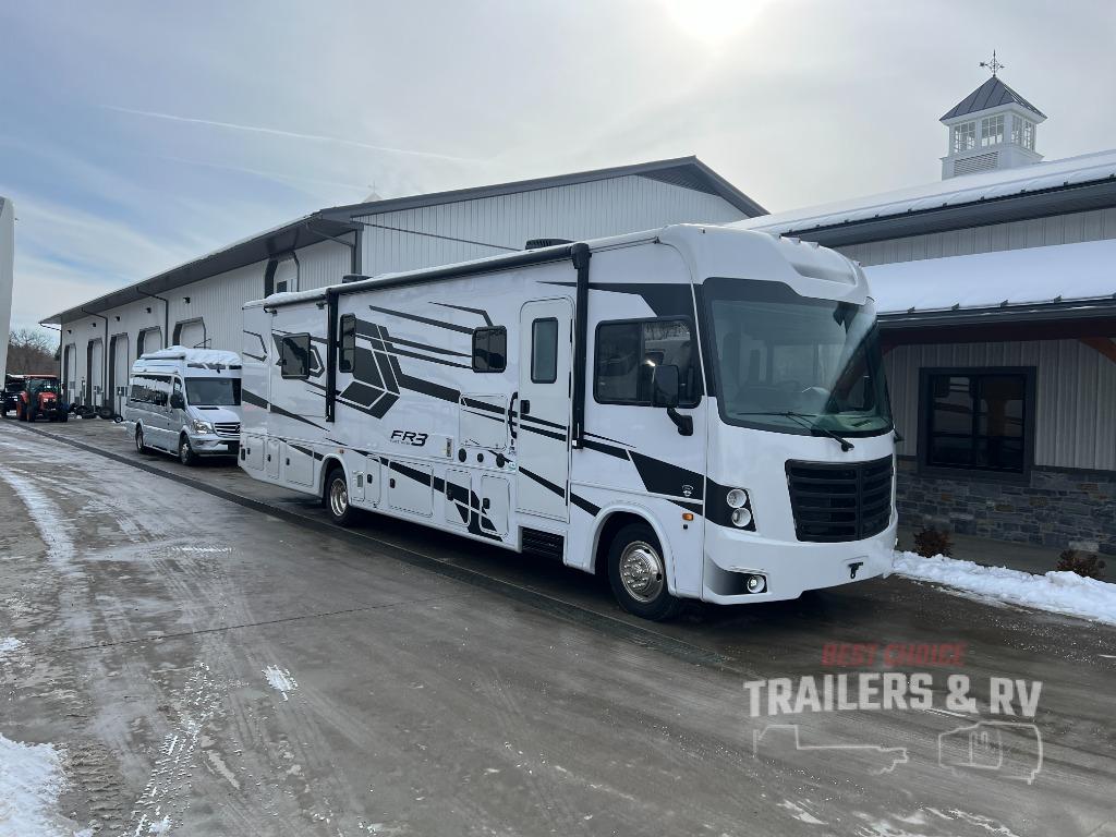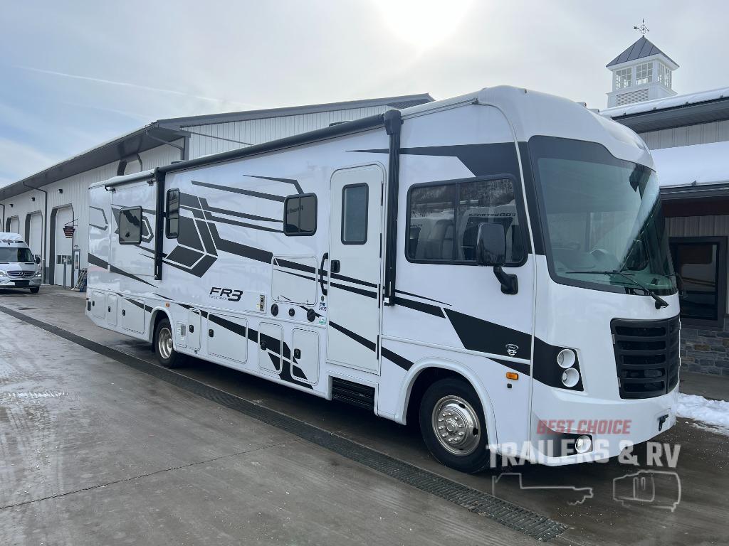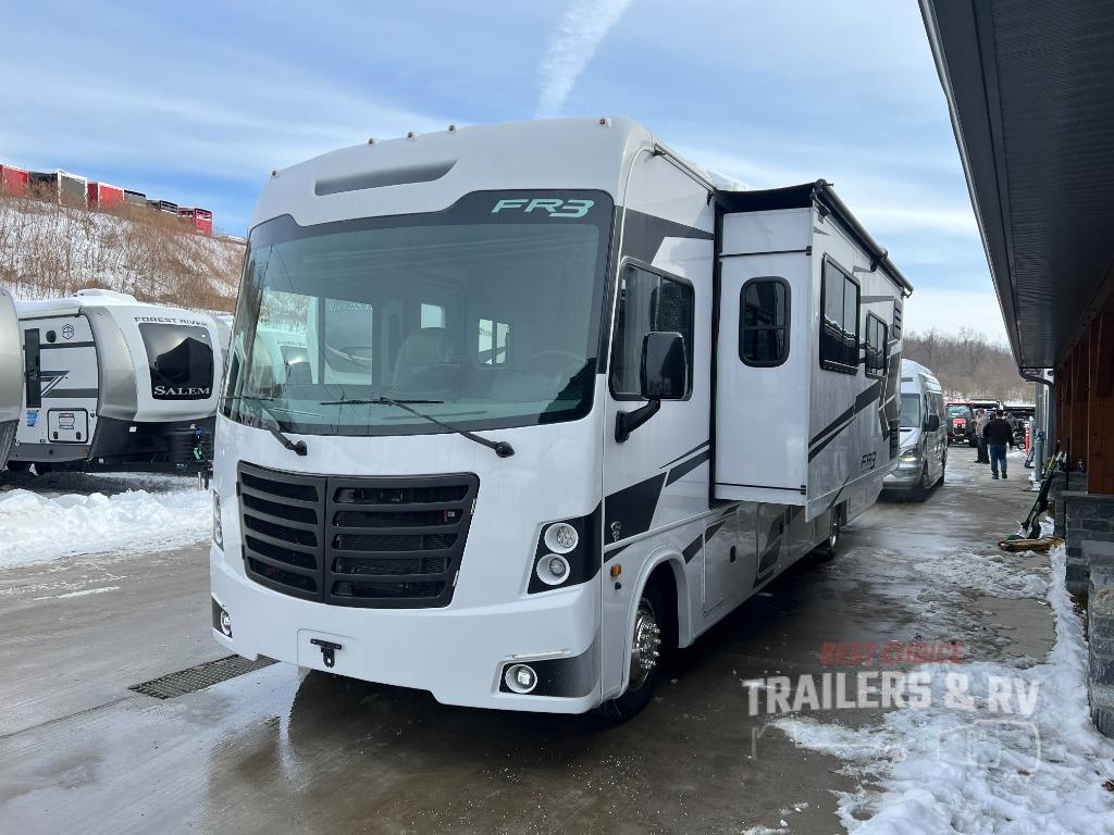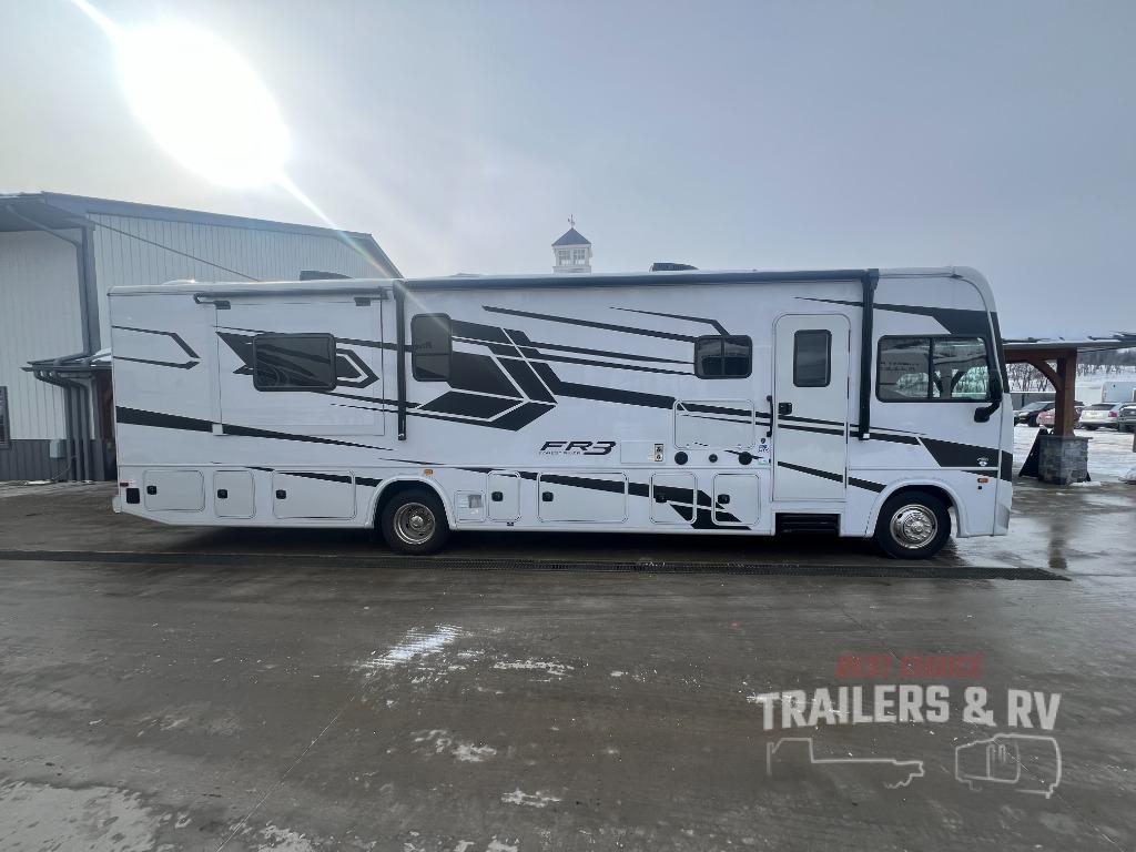 With each FR3 Class A gas motorhome by Forest River, you will find an easy-to-drive coach with a spacious interior allowing you to gather with friends and family with convenience and style found throughout! Each is built with vacuum-bonded construction, a one-piece fiberglass roof with extended rain spouts, a steel firewall and A-pillar extension, Bi-LED headlamps and lower LED fog lights, and grey Rotocast storage boxes with drains. Inside, you will enjoy black hardware, appliances, plumbing fixtures, and a glass shower door frame. You will also find a stainless steel kitchen sink with a bamboo cutting board and roll-up dryer, heavy-duty full-extension ball bearing drawer guides, dual-access dinette storage with doors, and nightstands with charging stations to keep your cellphones ready for whatever is next. Make your selection today!