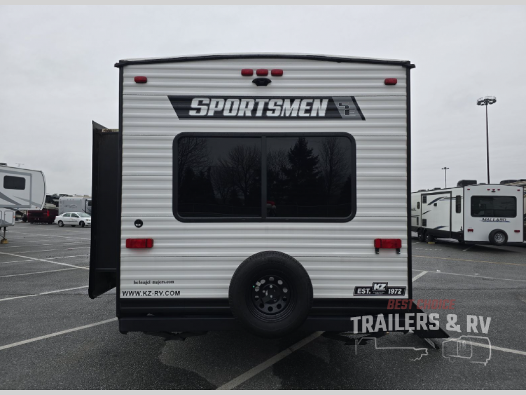Each Sportsmen SE travel trailer and toy hauler by KZ is constructed with KZ exclusive tough shield exterior metal, a one-piece seamless walk-on Tufflex roofing material, and diamond plate rock guard to protect your unit from road debris. You will appreciate the extra large baggage doors for stowing away your gear when not in use, and tinted windows to help keep the harmful sun rays out plus keeping it cooler inside. Some of the exterior conveniences found in the mandatory Advantage Package are the solid folding steps with large folding grab handle for easy entry and exit, a power tongue jack for ease in setting up your unit, plus an exterior shower for your pets or to rinse off before you head inside. You'll also appreciate the nitrogen-filled tires, solar and backup camera prep, plus a Leash Latch with a bonus beverage opener. You'll feel right at home inside with linoleum flooring throughout, a 13,500 BTU air conditioner, large overhead cabinets, a shower surround, and much more!