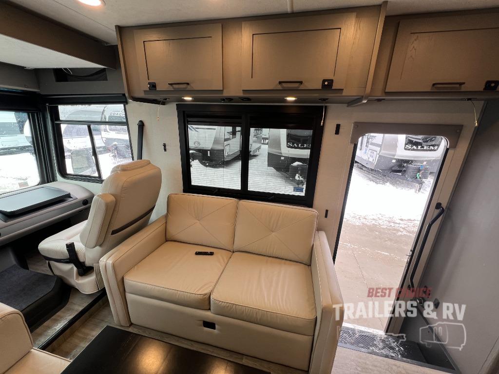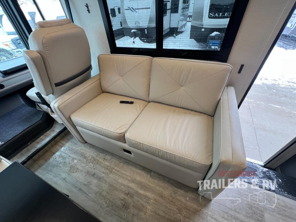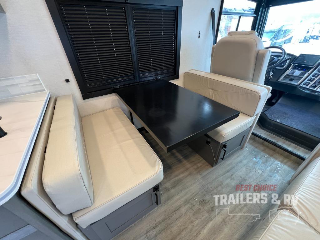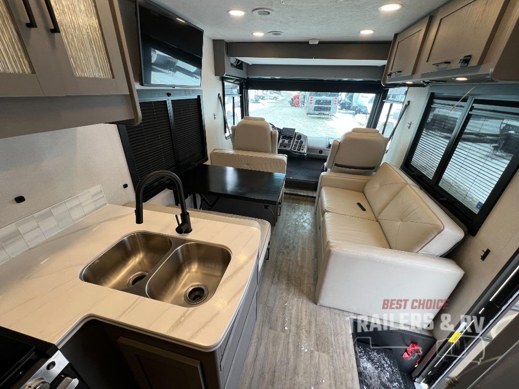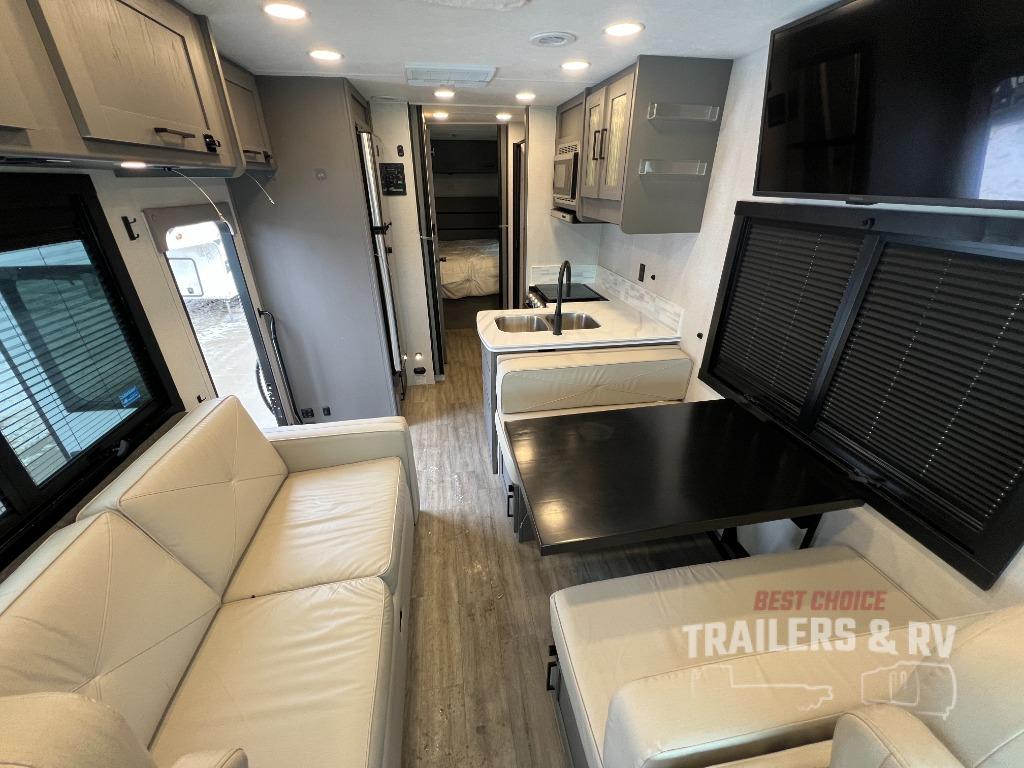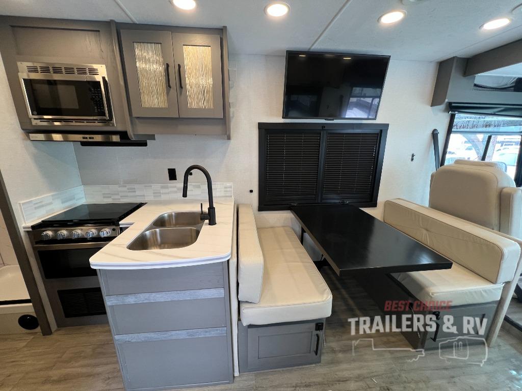 Live your best life on the road with this motorhome! The rear private bedroom has a 60" x 74" queen bed to lay your head on at night with wardrobes on either side of it for your clothes. A separated bathroom makes it easy for one person to freshen up in the 24" x 32" shower while another uses the private toilet and sink. Enjoy home cooked meals while out on the road with the stainless steel three burner cooktop, the 12V stainless steel double door 10 cu. ft. refrigerator, and even the stainless steel microwave oven. Eat your meals, play card games, and even transform the 42" x 70" booth dinette into an extra sleeping space. The 63" sofa has storage below for an extra blanket or board games. If you need to get some work done while you're away then you will appreciate the computer work station with 12V, 110V, and USB outlets in front of the passenger chair!