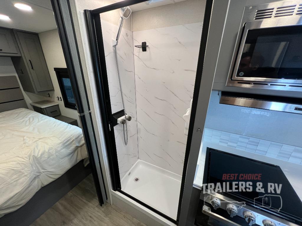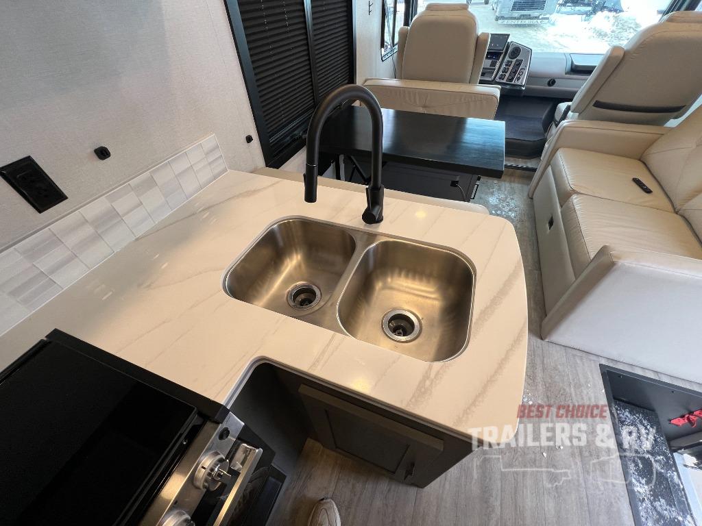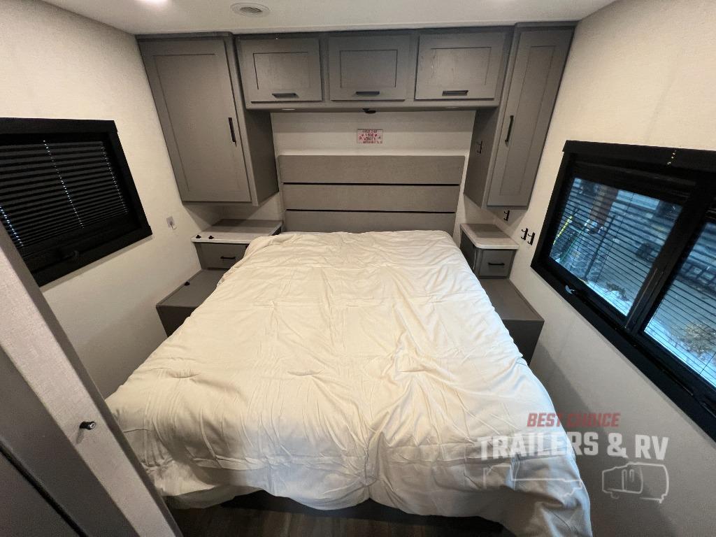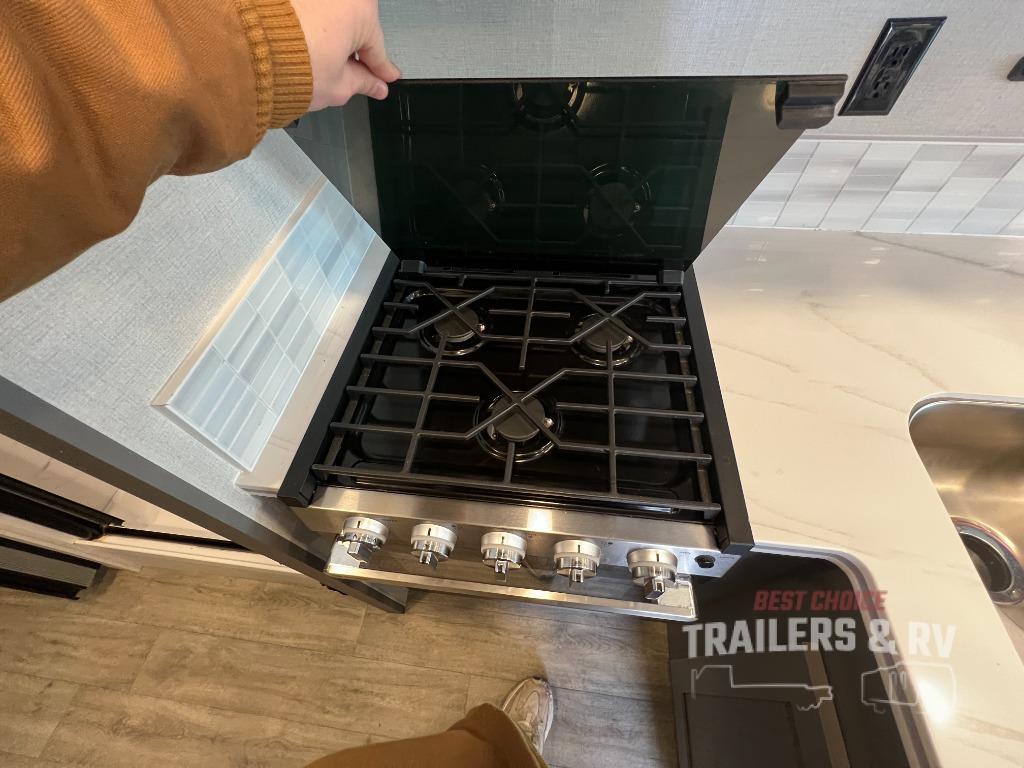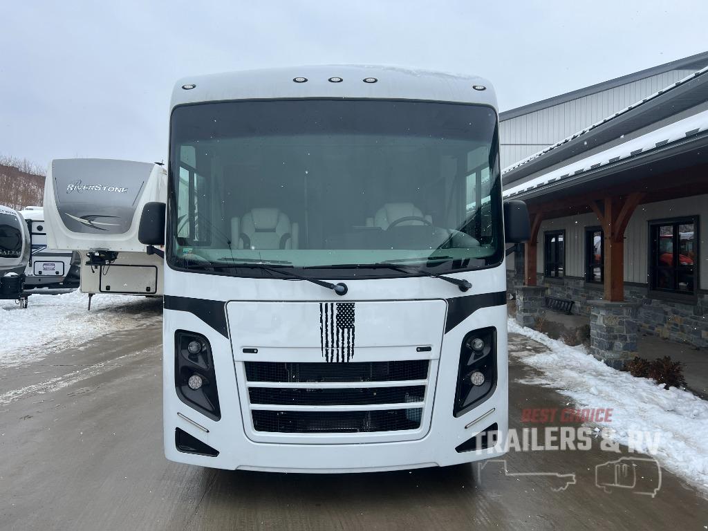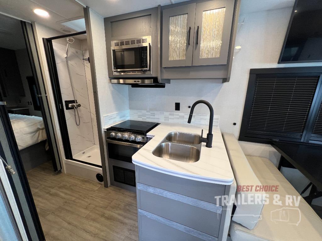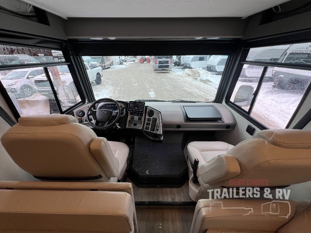 Live your best life on the road with this motorhome! The rear private bedroom has a 60" x 74" queen bed to lay your head on at night with wardrobes on either side of it for your clothes. A separated bathroom makes it easy for one person to freshen up in the 24" x 32" shower while another uses the private toilet and sink. Enjoy home cooked meals while out on the road with the stainless steel three burner cooktop, the 12V stainless steel double door 10 cu. ft. refrigerator, and even the stainless steel microwave oven. Eat your meals, play card games, and even transform the 42" x 70" booth dinette into an extra sleeping space. The 63" sofa has storage below for an extra blanket or board games. If you need to get some work done while you're away then you will appreciate the computer work station with 12V, 110V, and USB outlets in front of the passenger chair!
