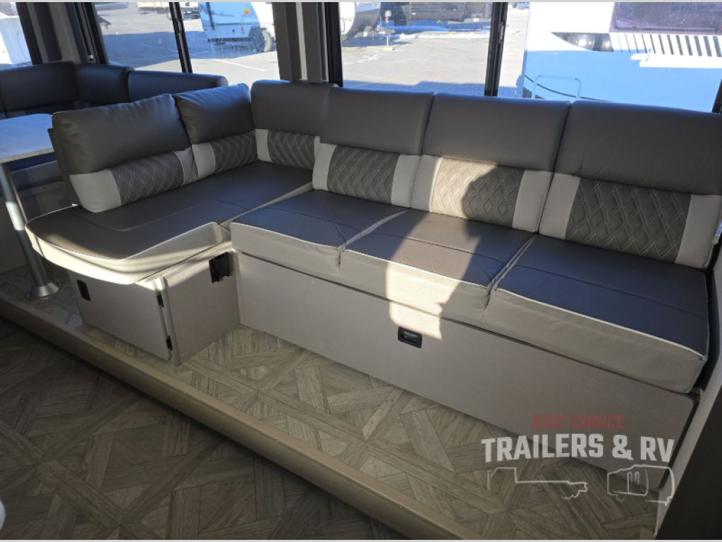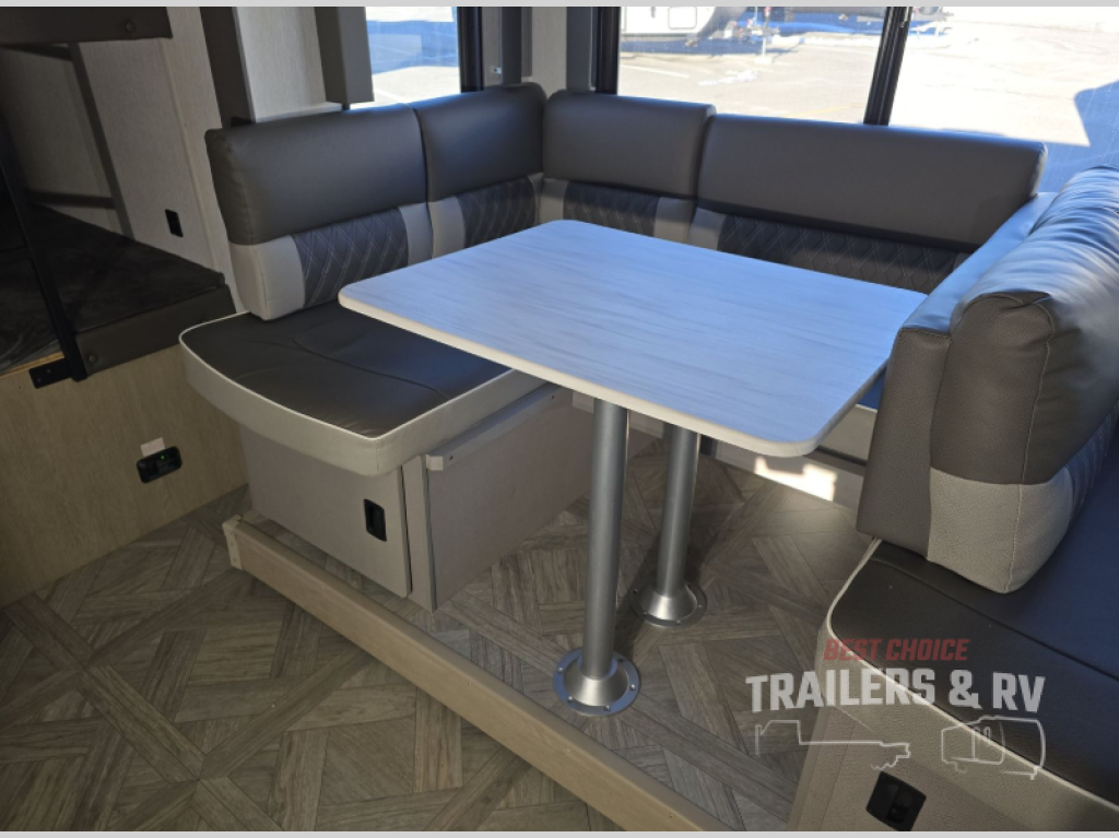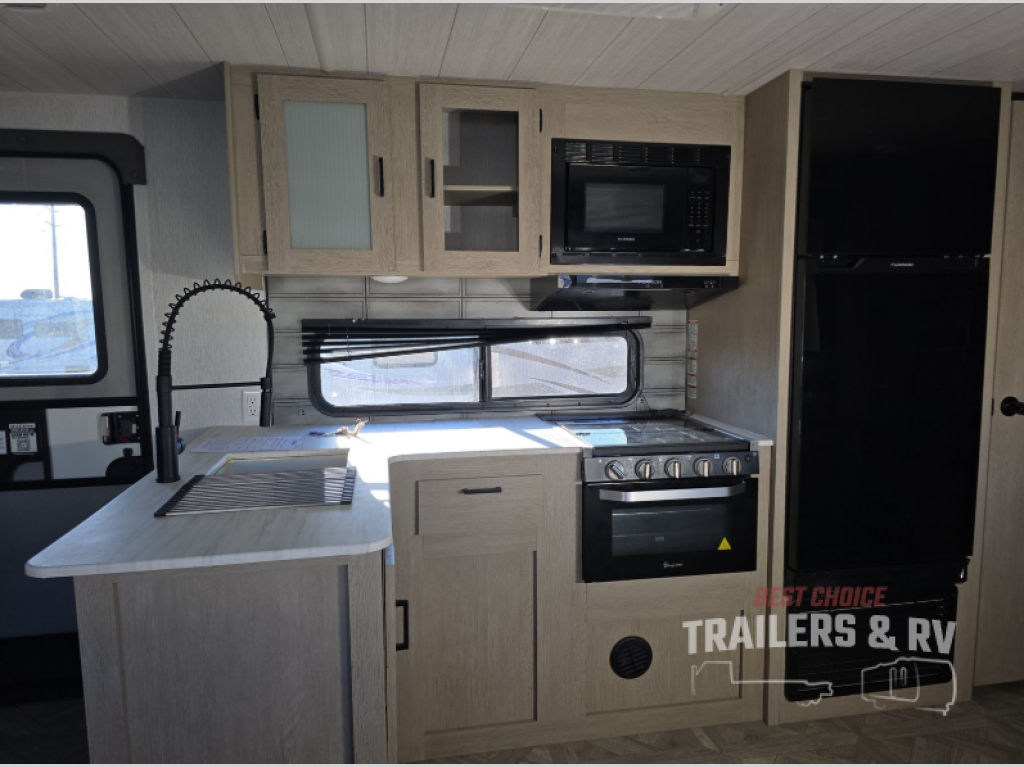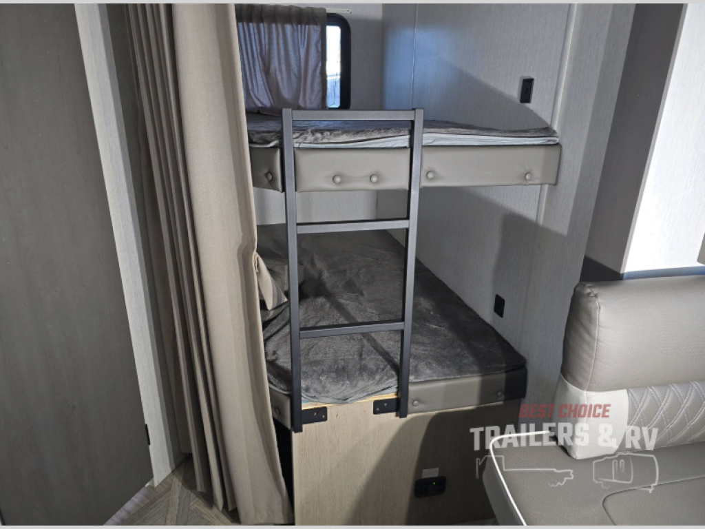 If you're looking for a travel trailer that will meet your family's needs then this one is for you! The kiddos will enjoy a good night's rest on the rear corner double-size bunk beds and you will enjoy a good night's rest on the custom king bed inside the front private bedroom. You can also transform the U-shaped dinette and Versa-lounge into extra sleeping spaces. One of the dual entrances leads directly into the rear corner bathroom which has a walk-in shower so you can get clean and refreshed each morning. The walk-in pantry is big enough to store your favorite snacks and the oversized 11 cu. ft. refrigerator will keep your beverages nice and cold. There is also an exterior camp kitchen you are sure to love!
