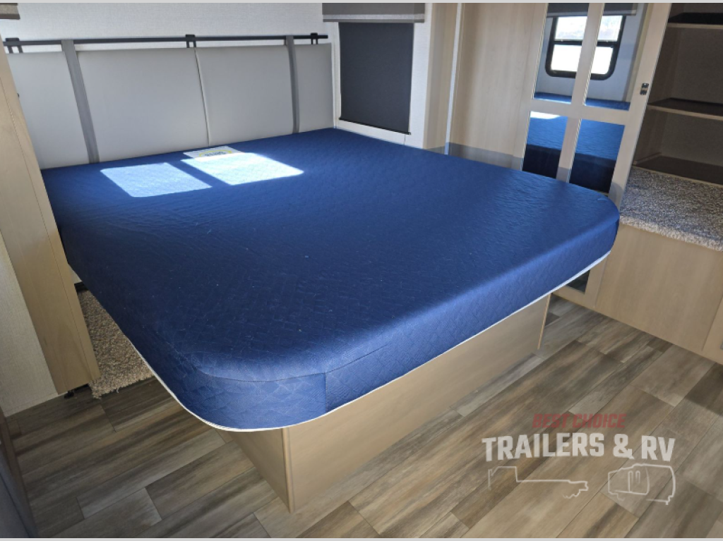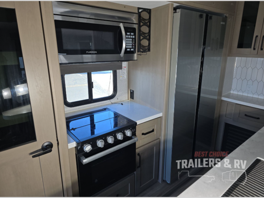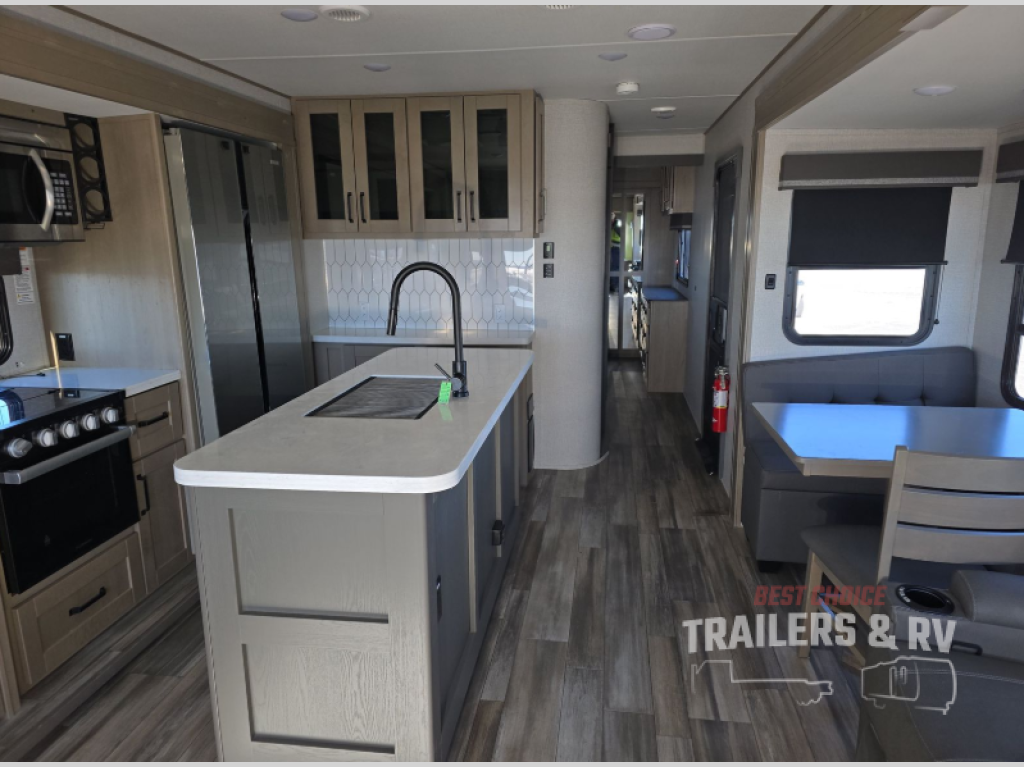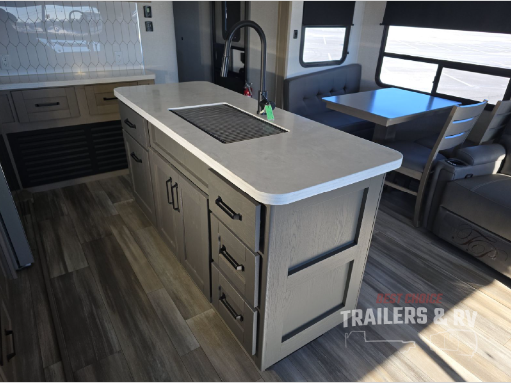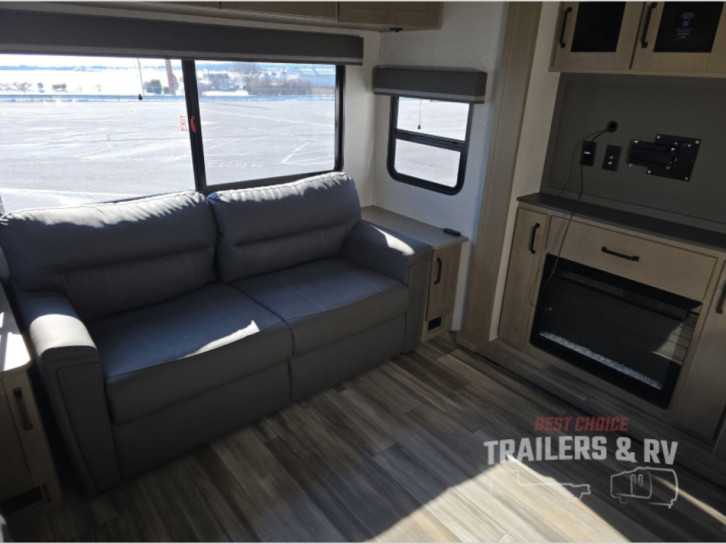 The chef of the group will love the gourmet kitchen including the 16 cu. ft. refrigerator that will hold lots of cold ingredients, beverages and leftovers, the center island when preparing and serving meals, and the hutch with overhead cabinets to display and store dishes and such. This area also includes two slide outs for more floor space and furniture to relax on including theater seating with cupholders for your drinks, a booth dinette to dine at and work from or choose a free standing dinette option, and a rear tri-fold sofa that offers sleeping space for two at night. There is a 40" LED HDTV with fireplace below to enjoy while inside, plus there are two awnings outdoors to relax under. When you are ready to call it a night, get cleaned up in the full bathroom, and retire to your front bedroom with a slide out queen bed or choose a king option, a front full-wall wardrobe with washer/dryer prep, a dresser and an additional wardrobe with drawers.