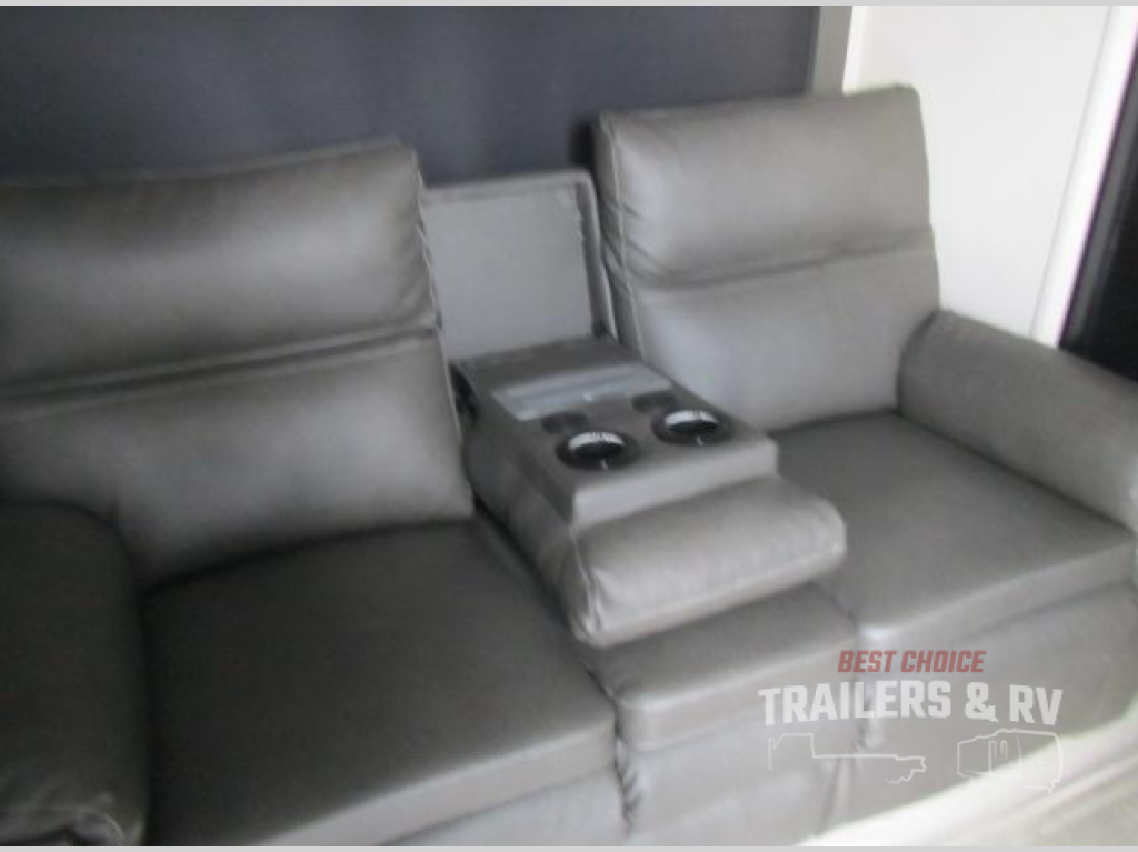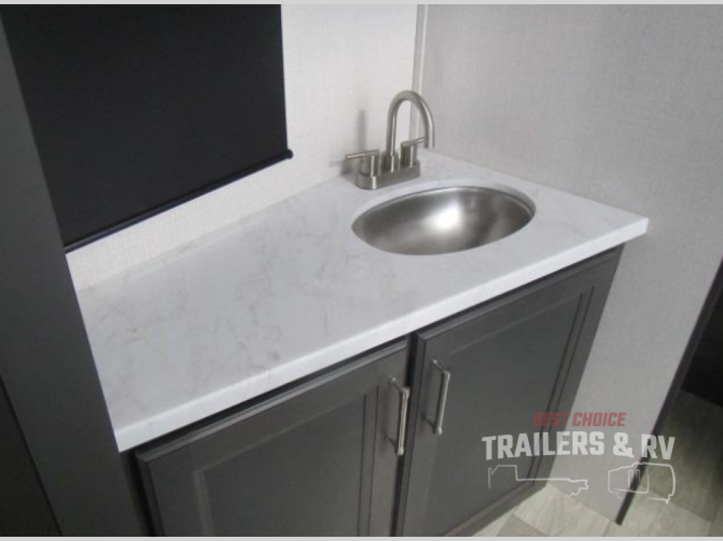 This Cougar Half-Ton travel trailer has an excellent dining area with its huge rear U-shaped dinette! Right next to the dinette is a large slide out that holds the 68" tri-fold sleeper sofa, 10.4 cu. ft. refrigerator, and a pantry. The kitchen has been excellently appointed with a Furrion range, seamless, pressed countertops, a stainless steel undermount sink, and a microwave, and you will be grateful that you can access both sides of the walk-through bathroom. The private bedroom is ultra convenient with its exterior entrance, king-size bed, and dual bedside drawers and dual nightstands.