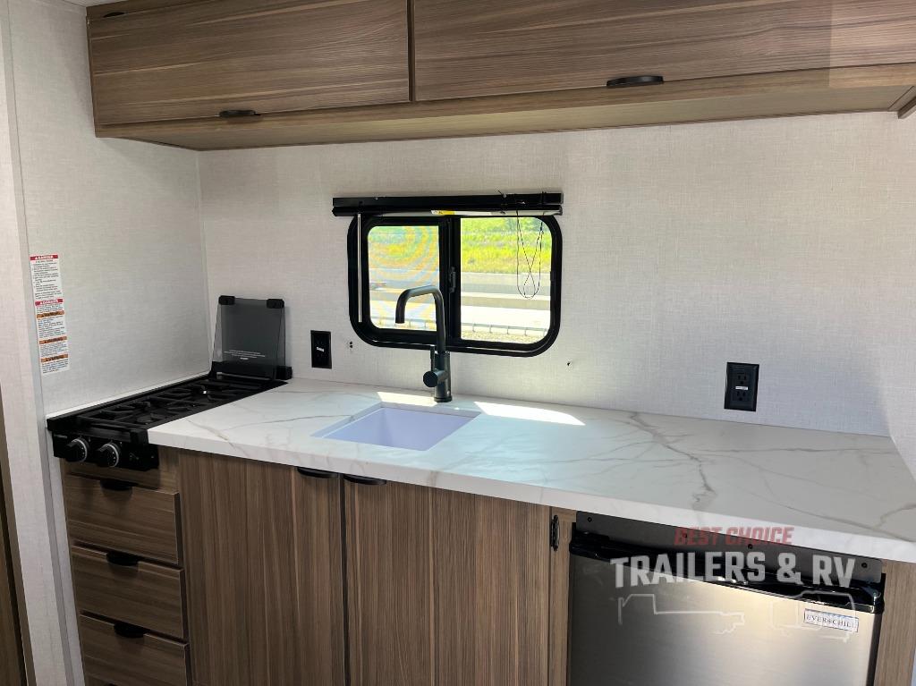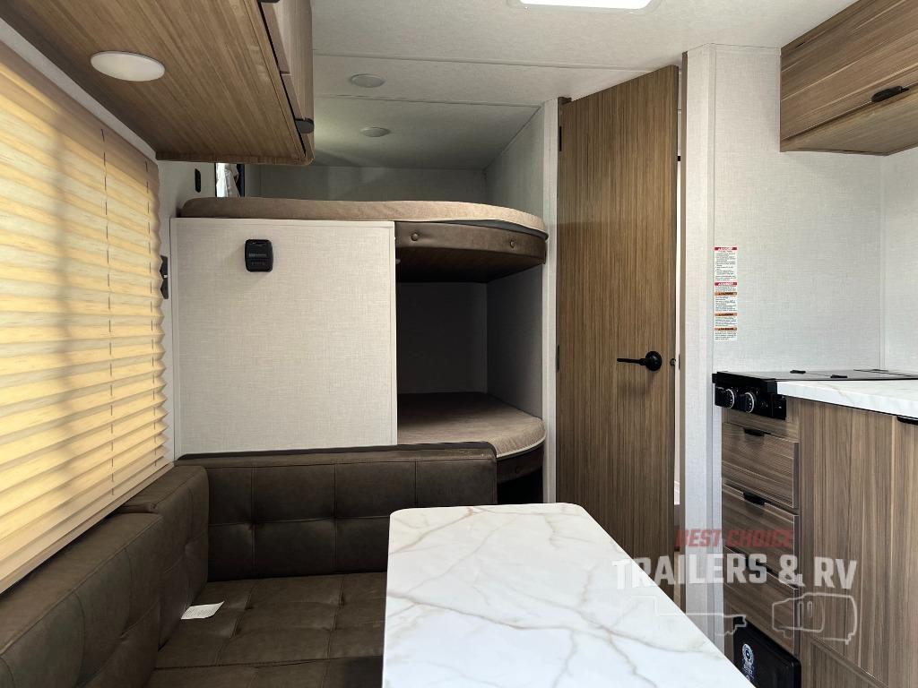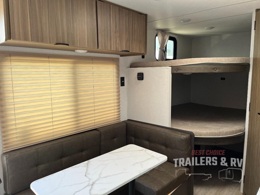 The double-size bunks with storage will be a big selling point in this travel trailer! While your guests take the bunks, you can have the front queen bed all to yourselves, and there is a wardrobe to keep your things organized. A two burner cooktop and microwave will let you make meals each day, and you can dine at the open lounge with a table.
